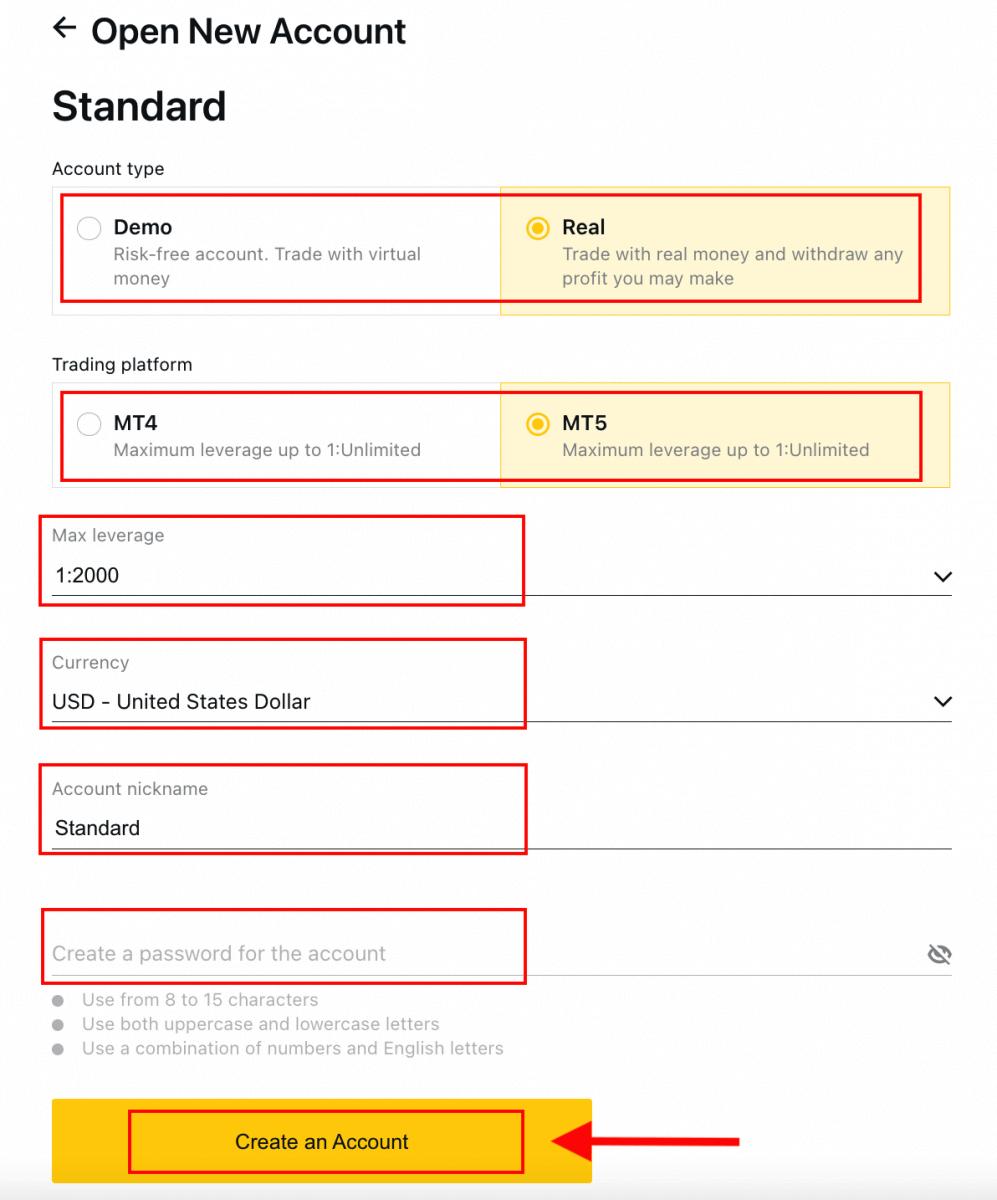 3. Choose your preferred account type under MetaTrader 5 and MetaTrader 4 fields.