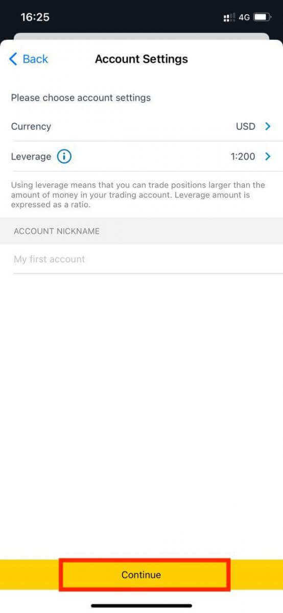 4. Set the account currency, leverage, and enter the account nickname. Tap Continue.